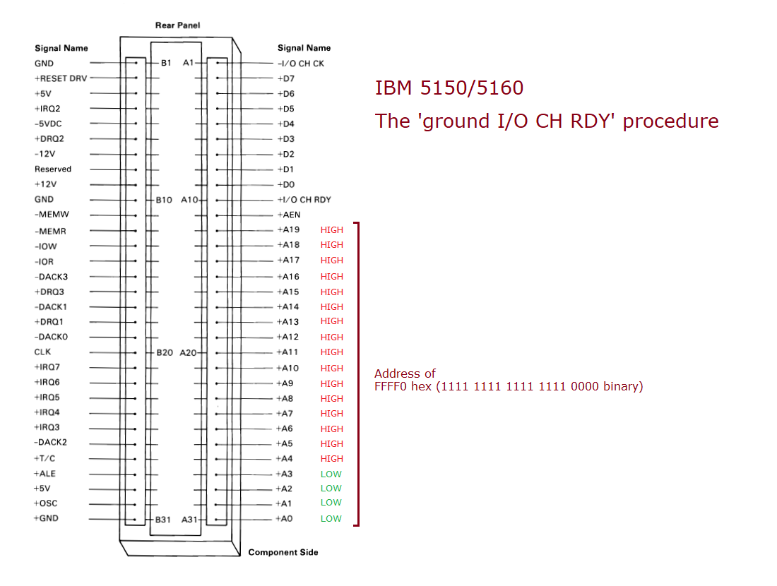 | Step 4.1 | On the address pins (A19 to A0) of an ISA slot, expect to measure the address of FFFF0 hex (1111 1111 1111 1111 0000 binary). See here. |