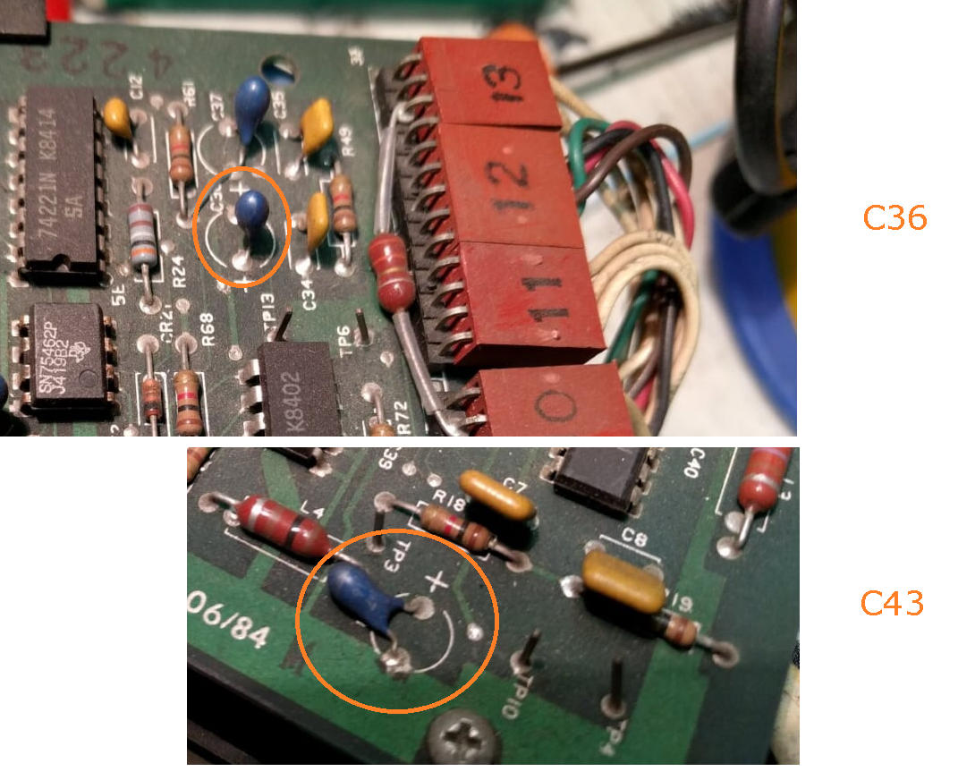 C36 and C43 are tantalum type capacitors, each having the value of 4.7μF/16V. Substitute an aluminium electrolytic type if you want. Also, if you want, you can use a higher voltage rated version, e.g. 4.7μF/25V. These capacitors are polarised, so make sure that the positive leg of the replacement capacitor goes into the hole marked with a '+' sign.