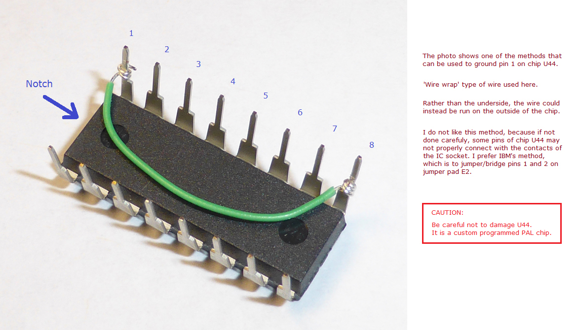 | Note 1 | An IBM supported modification is possible that allows 640K of RAM to be fitted in the RAM sockets of the 64-256KB motherboard. You will need certain parts. The procedure can be found here. Be sure to keep track of what you do, so that if things do not work out, you can undo what you have done. If you are successful, consider marking the motherboard in some way to remind yourself (and others) that the motherboard has been modified. Note that as the pointed-to procedure indicates, the jumpering of pins 1 and 2 on jumper pad E2 (photo), is the same as connecting pins 1 and 8 of U44 together via wire (photo). Both achieve the desired outcome, which is the grounding of pin 1 of U44. Your choice as which of those two methods you use. |