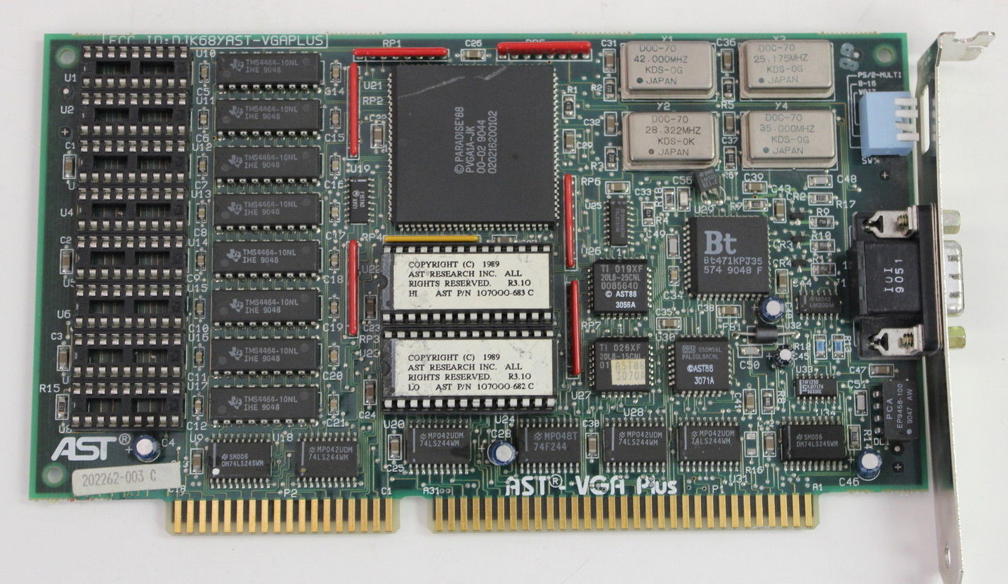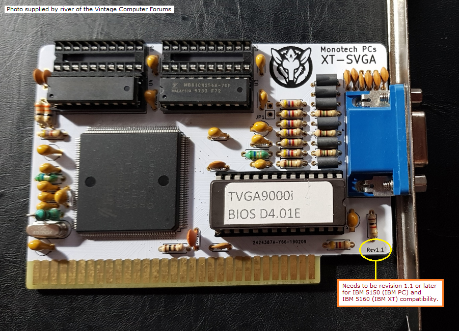 | Note 2 | I have one of these cards. The VGA-16 user's guide indicates 5160 (IBM XT) compatibility, and indicates how to force the card into 8-bit operation. But whilst I can get my card to operate in a 16-bit slot, I have been unable to get my card to operate in 8-bit mode (fitted to a 5150/5160/5170). Maybe my card is faulty. Also, I have noted that the user's guide indicates an FCC ID of D2A62LTJWBJC, whereas my card has the FCC ID of D2A62LVGA16. Maybe I have a later version of the card, in which 8-bit operation was dropped! |