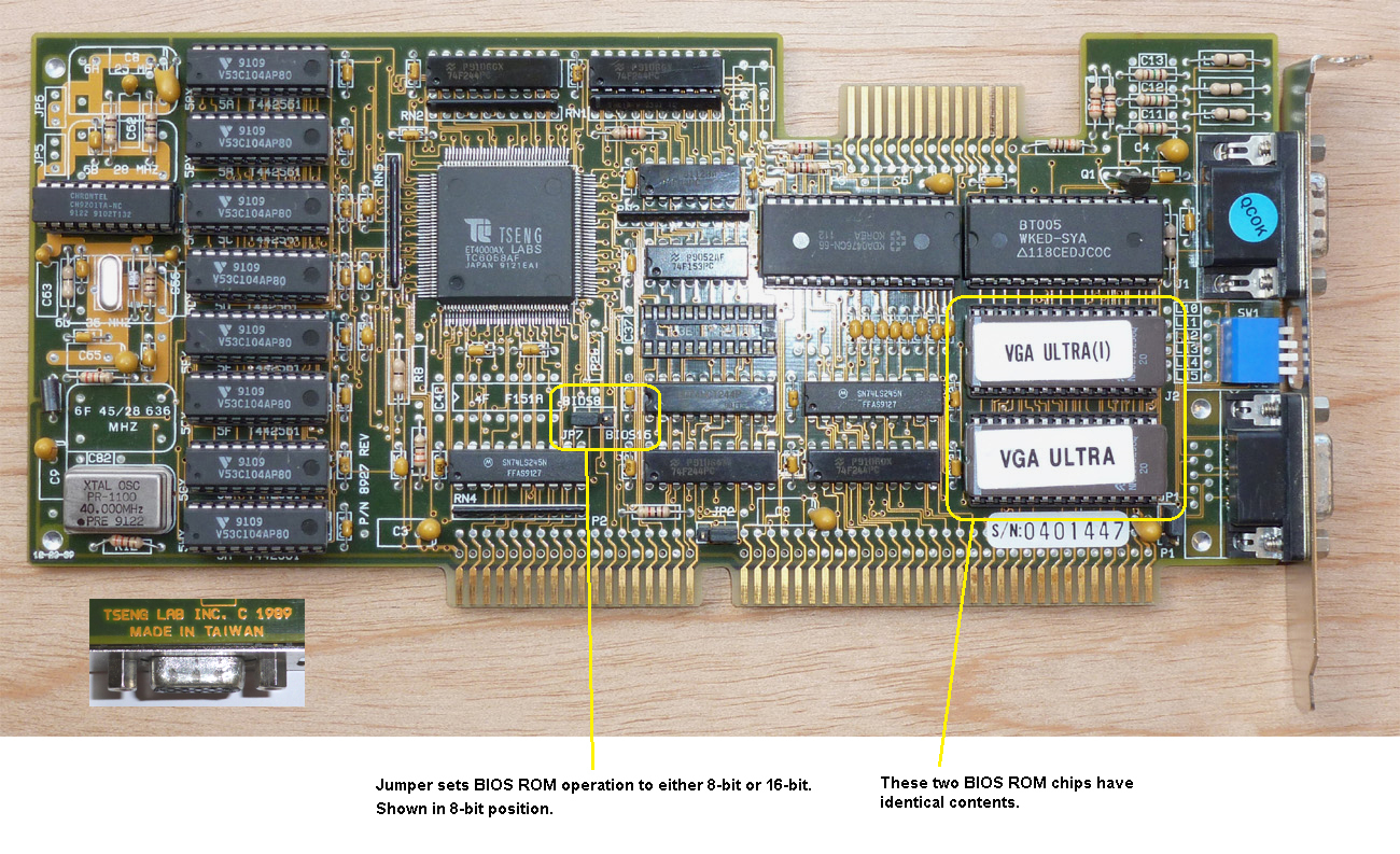 | Note 1 | Printed on the PCB is, "TSENG LAB INC." and "P/N 8927". On power up, the card displays, "VGA-4000". Set the BIOS8/BIOS16 jumper to BIOS8 (force BIOS ROM reads into 8-bit mode). |