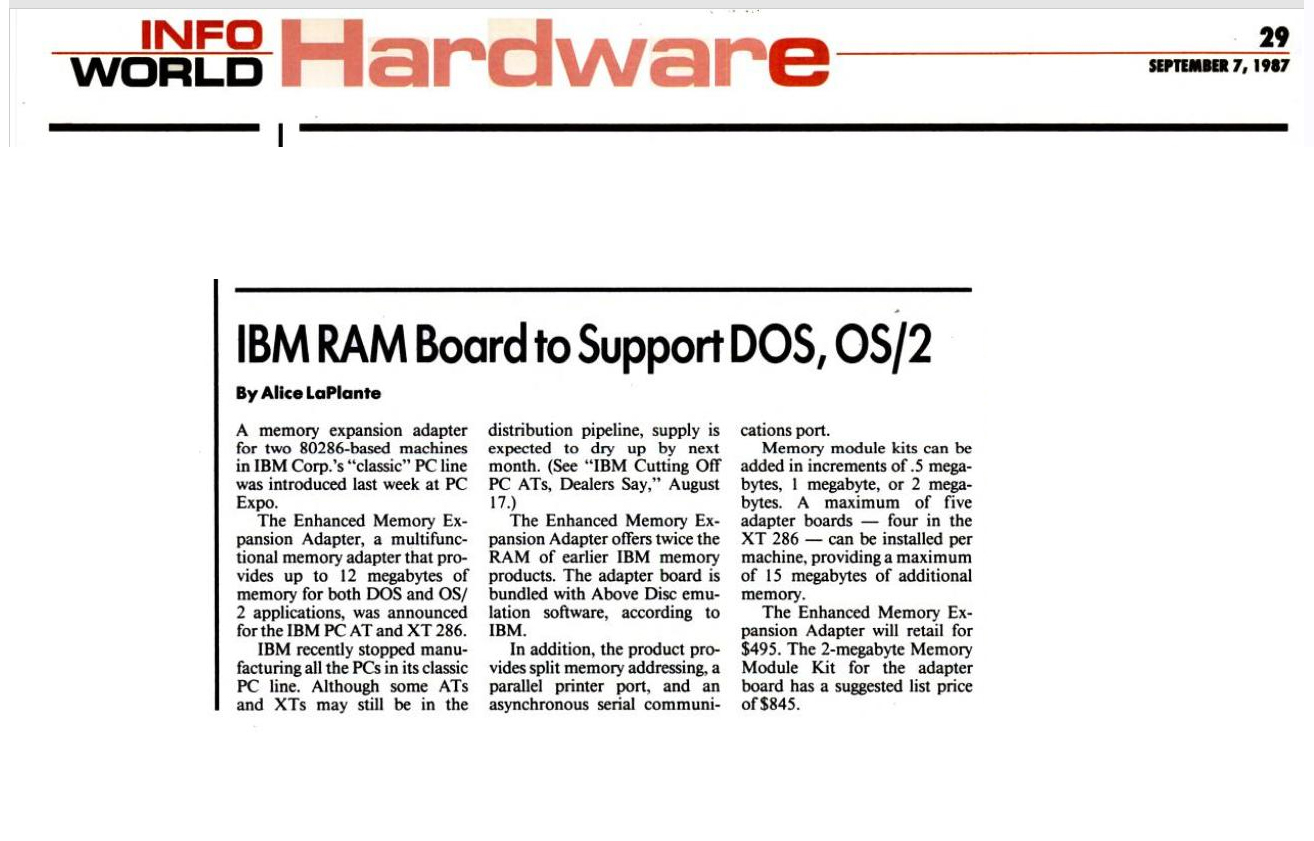 Provides up to 12 MB, via twelve 1 MB sized SIMMs, of extended memory. Optionally, 256 KB and 512 KB SIMMs can be used instead, but per IBM's documentation, there are specific requirements/restrictions.
