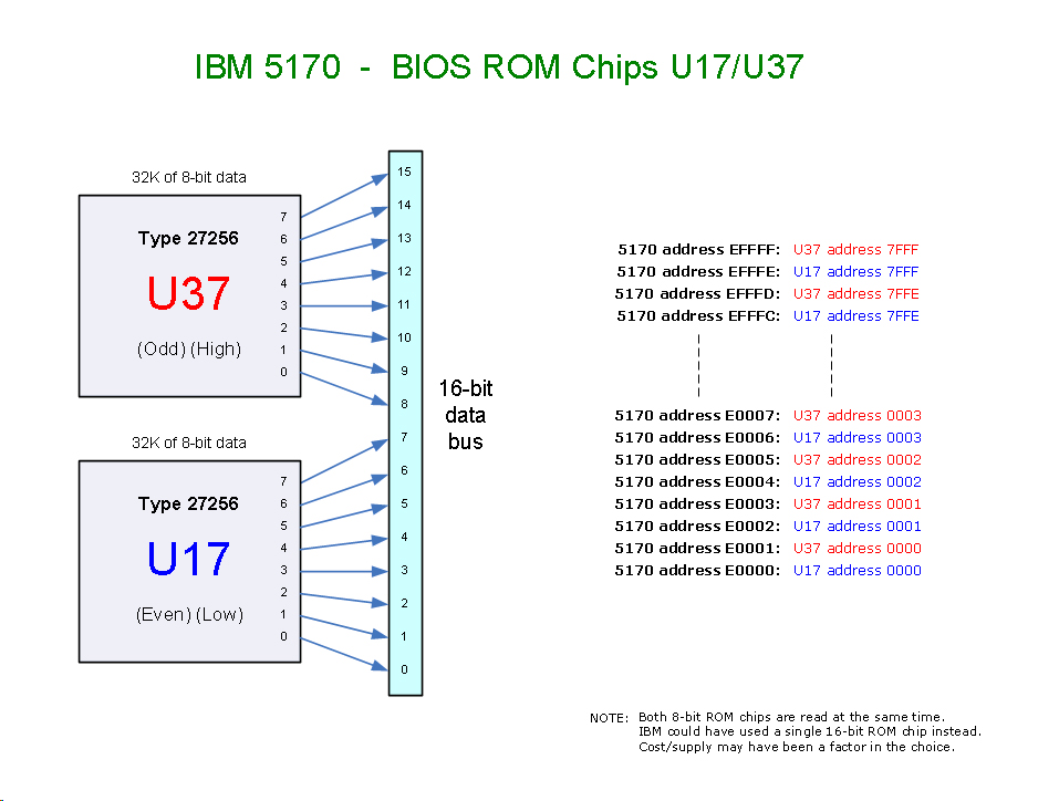 Sockets U17 and U37 are paired, just like sockets U27 and U47. And just like sockets U27/U47, these sockets are 8-bit, supplying 16 bits to the IBM 5170's 16-bit data bus. A diagram showing how pair U17/U37 supply 16 bits, is at here.