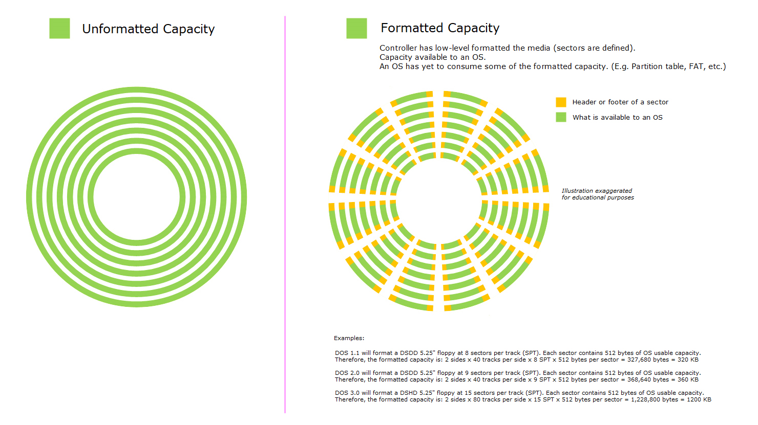 | Note 3 | • Also applies to '320K' floppies and '320K' drives. • A photo of IBM describing a floppy drive as "320KB" is at here. • A '320K' drive and a '360K' drive are the same thing. If anything, IBM should have referred to them '500KB' drives instead (i.e. the unformatted capacity). • A '320K' floppy: DOS has formatted a DSDD (2S2D) 5.25" floppy using 8 sectors per track (introduced in DOS 1.1). • A '360K' floppy: DOS has formatted a DSDD (2S2D) 5.25" floppy using 9 sectors per track (introduced in DOS 2.0). |