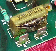 For RIFA made capacitors like this one, the rupture is accompanied by smoke and a strong foul odour. The odour will persist until the capacitor is removed. The capacitor contains fluid, which may leak out. Do not touch the fluid (it may be carcinogenic, or otherwise toxic). The "X" in "0,1µF@X" probably indicates that this capacitor is of class X (expected because it sits between line and neutral). |