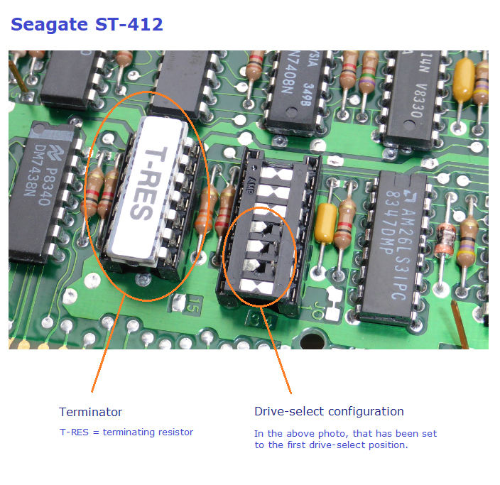 Click here to see what the terminating resistor (terminator) and shunt block on the IBM supplied Seagate ST-412 looks like.