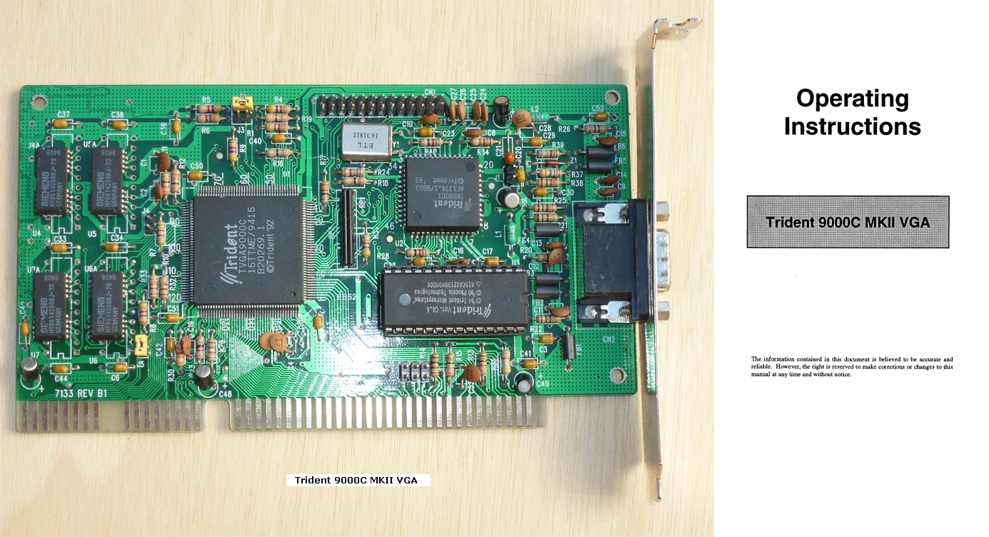 | Trident 9000C MKII - Operating Instructions | (ISA VGA card) | ("MKII" means mark 2, a second version of the card) (testing by me indicates the requirement for a 286 CPU or better) (photo) |