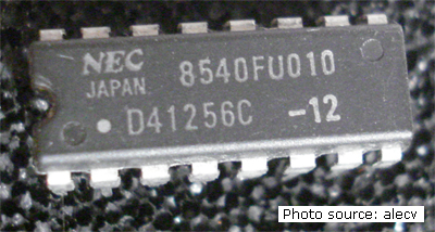 | NEC | µPD41256C-12 | 120 ns | NMOS | 256cycle/4ms | photo | 41256 list 1 | 41256 list 4 | 41256 list 5 | datasheet | As shown in photo, the prefix of "µP" is not printed. | |