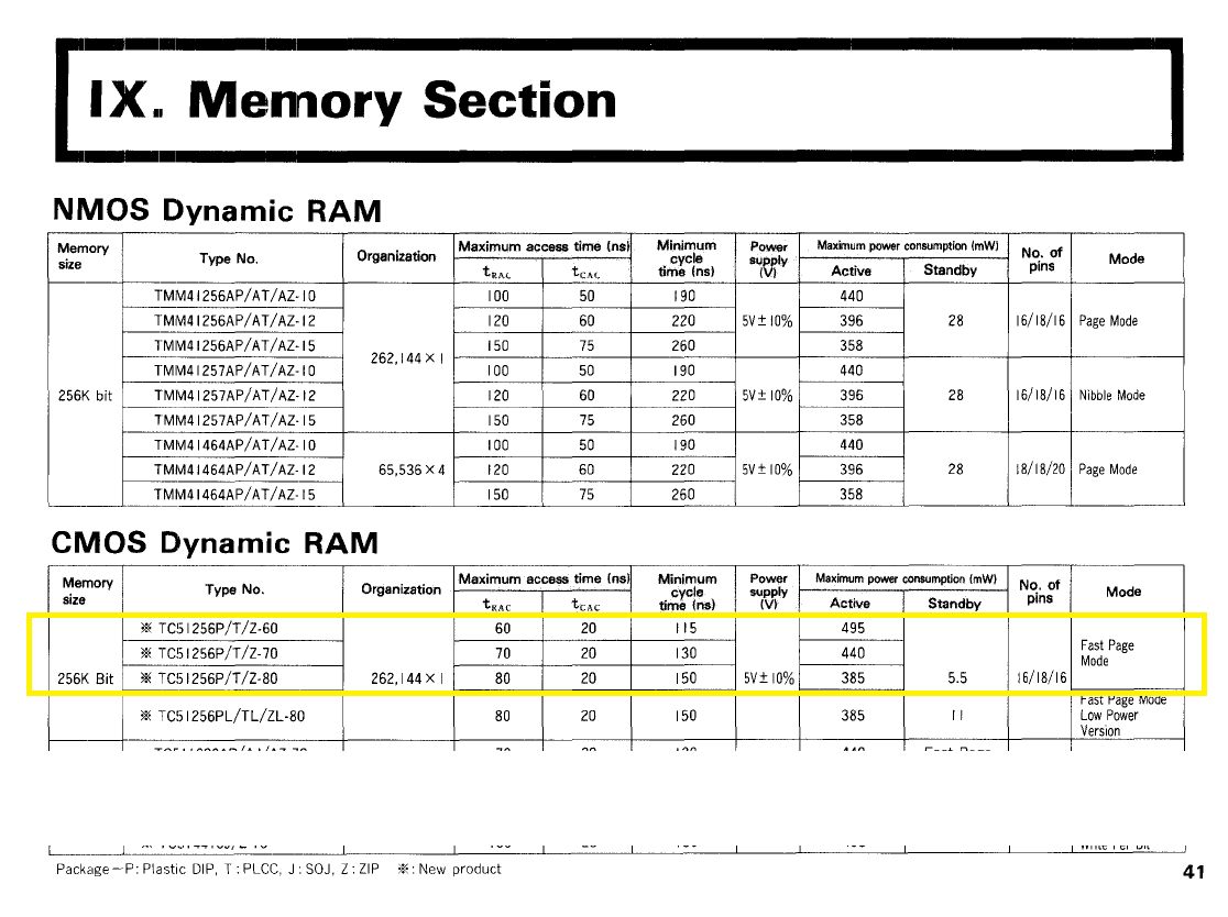 | Oki | MSM51C256-80 | 80 ns | CMOS | 256cycle/4ms | 41256 list 6 | datasheet | Datasheet contains "its I/O pins are TTL compatible" | ||||