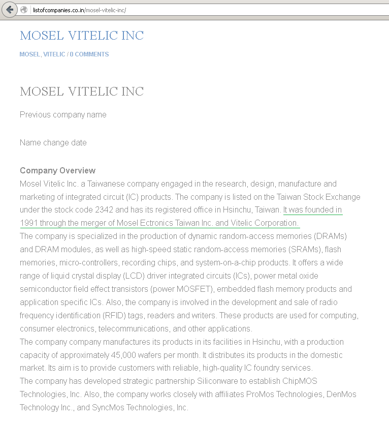 | Vitelic | V53C256-80 | 80 ns | CMOS | 256cycle/4ms | 41256 list 3 | In 1991, Mosel and Vitelic merged to form Mosel Vitelic Inc. | |||||
