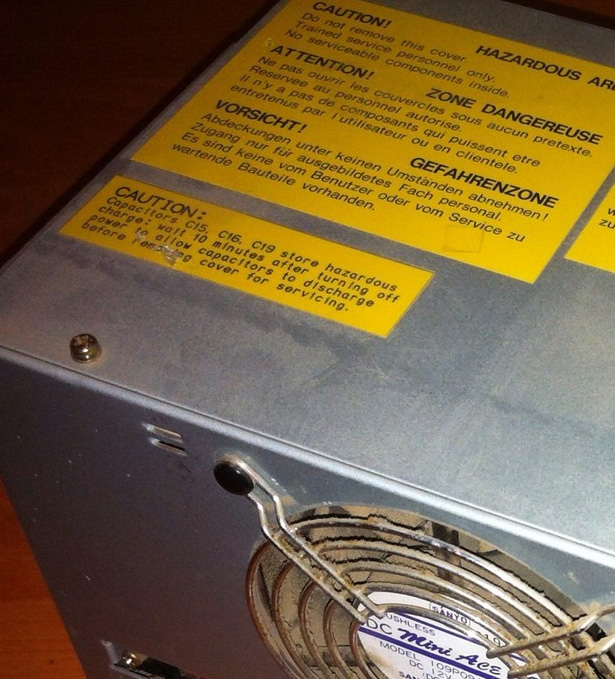 | • | The large aluminium electrolytic filter capacitors are considered hazardous, because of the combination of high voltage and high charge. You need to 'treat them with respect'. When you remove AC mains (house) power from the power supply, these filter capacitors take time to discharge. In most (most, not all) models of power supply, the discharge is speeded up by the use of a bleeder resistor. In rare cases, power supplies provide an indication (example) of how much time after power-off that they (that particular model) can be considered safe (from an electrical perspective), but what if some kind of failure in the power supply results in that time now being invalid ! To gauge discharge status, a voltmeter can be used to measure the voltage on the filter capacitors. For information on manually discharging the filter capacitors, see here. |