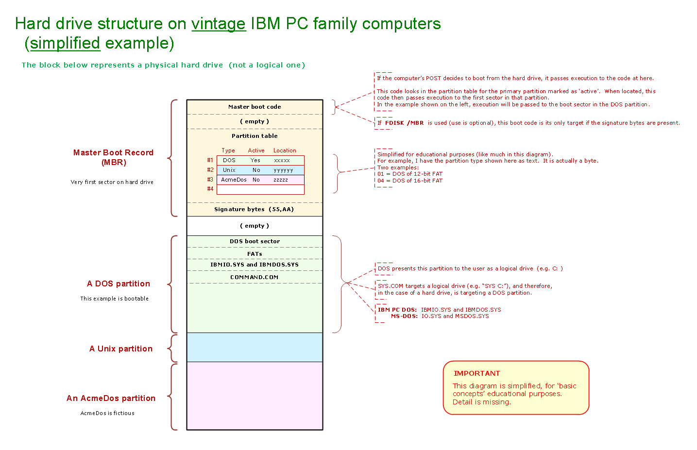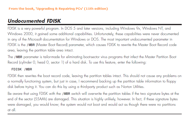| Notes | • The /MBR option of FDISK.EXE does not exist in early versions of DOS. • The /MBR option of FDISK.EXE targets the first hard drive (relevant if you have multiple hard drives in your computer). • The /MBR option of FDISK.EXE is further described at here. • Using FDISK.EXE to delete then recreate partitions does not 'touch' any existing master boot code in the MBR. That is why such use of FDISK.EXE does not fix the subject problem. • Using SYS.COM will not work, because, against a hard drive, SYS targets a DOS partition, not the MBR. |