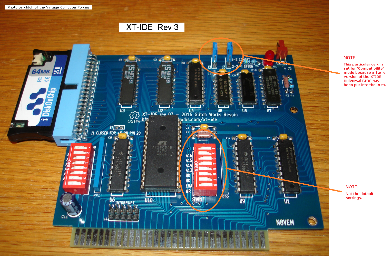 Circa 2009. Click on photo for larger view. Information at here. Configuration of adapter/controller/device type in XTIDE Universal BIOS (a.k.a. XUB): For 1.x.x versions of XUB (e.g. 1.1.5), set 'Bus type' in XUB per the photo at here. For 2.x.x versions of XUB (e.g. 2.0.0 beta 3+) , set the 'Device type' to 'XTIDE rev 1' |