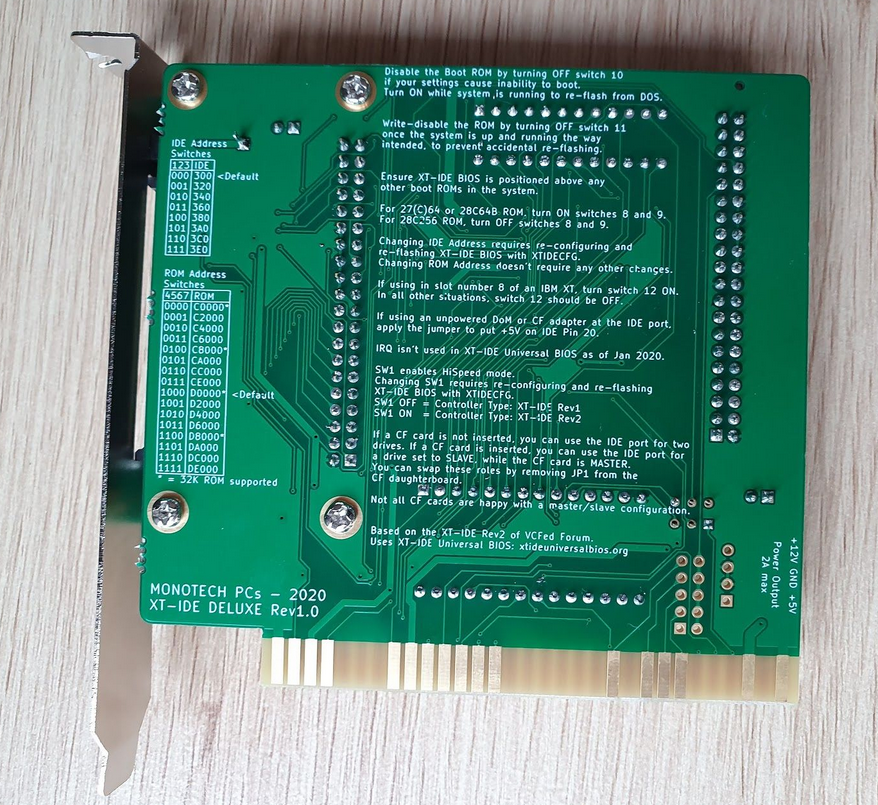 Click on photo for larger view. This is simply a rebranding of the 'Monotech XT-IDE Deluxe Rev 1.0'. "XT-IDE CF+" appears on back. Click here for back. Click here for end. Does not require a CF card that works in 8-bit mode. Configuration of adapter/controller/device type in XTIDE Universal BIOS (a.k.a. XUB): If SW1 is OFF, i.e. hi-speed mode is OFF, set the 'Device type' in XUB version 2.0.0 beta 3+ to 'XT-IDE rev 1' If SW1 is ON, i.e. hi-speed mode is ON, set the 'Device type' in XUB version 2.0.0 beta 3+ to 'XT-IDE rev 2 or modded rev 1' |