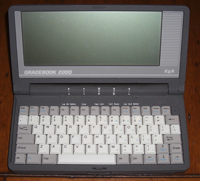The Lexicomp Gradebook 2000 (EGS) is merely more than a relabeled LC8600, but with the cool modem of the 8620 and (unfortunately) without the cool Kittyhawk HDD. I guess it was only sold to teachers to use it as an electronic Gradebook, since it comes with that rather crude gradebook system that relies on an SRAM card in the PCMCIA slot to store the students grades. On the right side it reads "EGS" which probably means Electronic Gradebook System. I doubt this was a best seller because compared to a 50 cent standard paper gradebook i don't see many advantages, so it probably also wasn't really a top selling product. On the bottom there is a hatch where you can access some EPROMs and dip switches, but i haven't really played with that. While it DOES come with sdpdrv.sys which WOULD allow using Flash based cards that driver is commented out in config.sys. So the only realistic chance to use flash cards is to either boot with a proper system or config from an SRAM PCMCIA card or to use something like DEVLOD to load the driver after system boot.