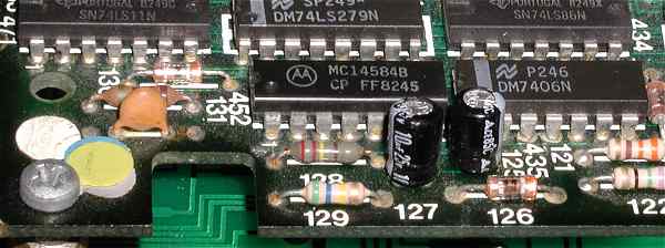 These are the capacitors in question. They are the black cylindrical electolytic, can capacitors of 10microFarad, 24v value, 127 & 125. Their gradual drying out changes their value and prevents the Newbrain from resetting properly. Consquently, if you get a display at all it is just a jumble of random characters. The three dead machines which I have resurrected, sprang imediately to life when they were replaced. Of these, two initially showed the random characters the other appeared to be totally dead.