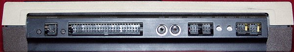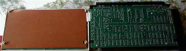 Front of the total unit removed from it's case. The multiple connections to the display are clearly visible, as is the black, coaxial cable connecting the UHF modulator with the TV out phono socket. The high voltage power supply for the flourescent display is also visible as the small cream coloured circuit board. This is shown in greater detail below.