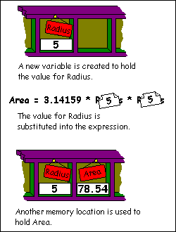 On the next line, something similar happens with the value for Area. The assignment is an expression, however, so it needs to calculate this first. When BASIC gets to the section with Radius, it goes to its variable list and finds the value. This is 5 from the previous line, so 5 is substituted into the expression. Once complete, the result is assigned to the newly created variable Area. The fourth line has BASIC retrieve the value and print it out after dressing with some text for clarity.
