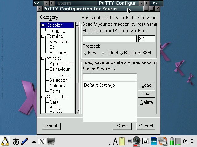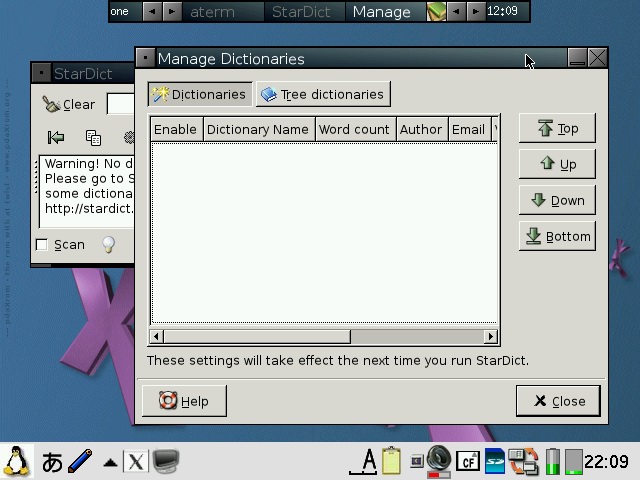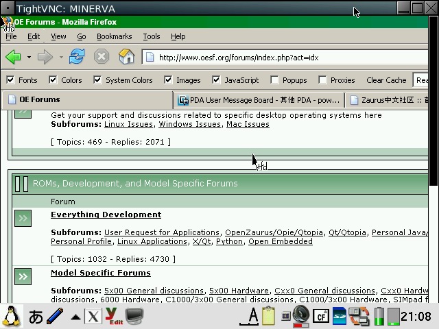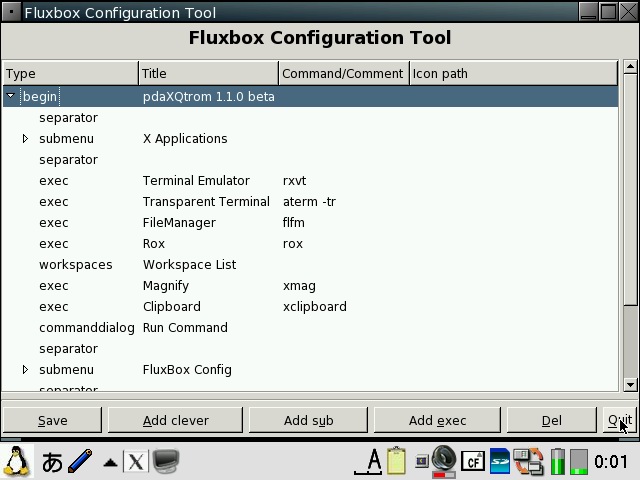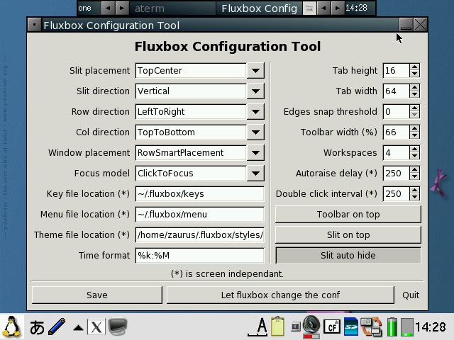 You will need to check both "Pass all backdrop mouse clicks to window manager" and "Blackbox root menus hack" in order to get the FluxBox menu back. pdaXqtrom also has multilingual support built-in as well. It has uim and anthy, as well as scim embedded. Some Japanese and Chinese fonts are also included. You can add additional fonts by copying them to /usr/share/fonts or .fonts under the user's home directory, ie /home/zaurus/.fonts